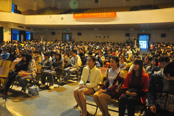 讲座当天,广西财经学院外国语学院的1500名师生早早来到大礼堂等待开场,会场布置得干净、整洁,师生们安静地坐在座位上。
