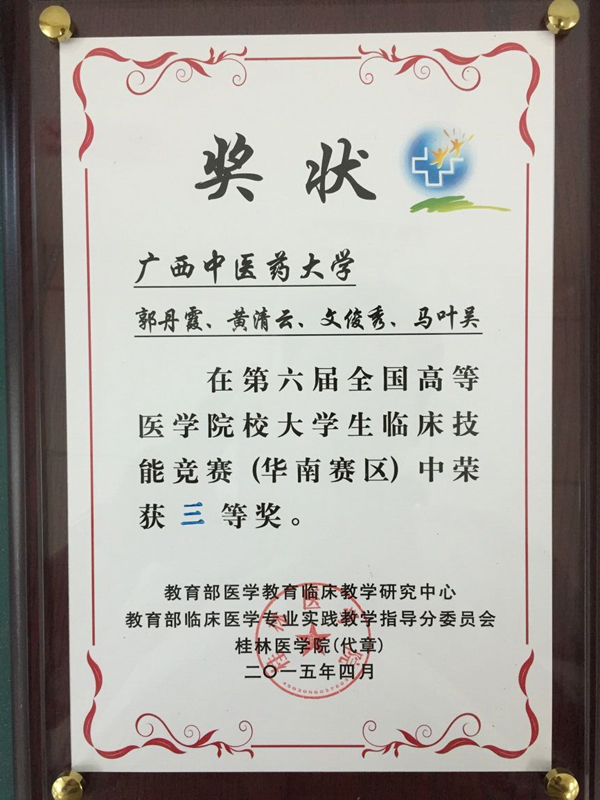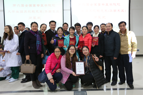 4月8日至9日,由教育部医学教育临床教学研究中心、教育部临床医学实践教学指导分委员会主办的第六届全国高等医学院校大学生临床技能竞赛华南赛区分区赛在桂林医学院临桂校区举行,来自广东、广西、海南三省共十三支队伍参加了比赛。我校作为华南赛区唯一一所参赛的中医药院校,由2010级临床医学专业黄清云、郭丹霞、文俊秀、马叶吴四名同学组成代表队参赛,与中山大学、南方医科大学、广州医科大学、广西医科大学等院校同场竞技,最终获大赛三等奖。
