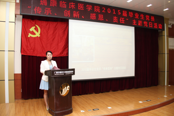 首先,由陈日兰副书记介绍了会议内容,详细解读“传承、创新、感恩、责任”主题的意义,并带领大家观看了瑞康临床医学院党组织建设与毕业生视频,重温了一起努力一起欢笑的5年大学生涯。