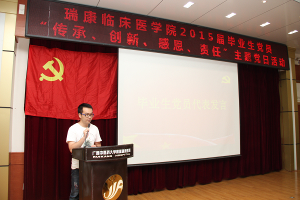 学校组织部李中华部长在讲话中指出:瑞康临床医学院在毕业生离校前夕,对2015届毕业生党员开展一次“传承、创新、感恩、责任”主题教育活动,教育毕业生党员摆正集体利益与个人利益的关系,一如既往地发挥共产党员先锋模范作用。做到一个共产党员就是一面旗帜,不管是在学校、在工作岗位还是在群众中,都能当先锋、做表率、树榜样。