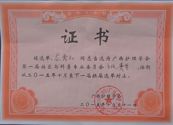 经过大会选举,我院护理部副主任龙秀红当选为首届广西护理学会社区与科普专业委员会主任委员,大外科护士长李勉当选为秘书,骨科护士长蒋娟当选为委员。