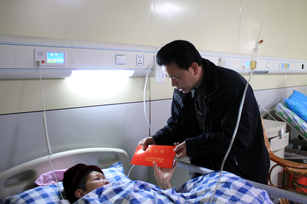 廖华武主任等人先后慰问了在我院心血管内科、神经内科三区(康复科)、骨科、肿瘤科、神经外科、消化内科、眼科等科室住院的55名全区各单位离休干部,向他们致以崇高的敬意和节日的祝福,祝他们早日康复,安享晚年。