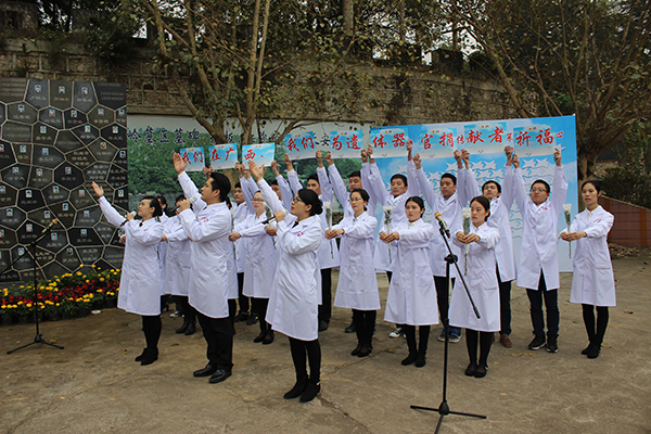 “带着爱而来,留下爱离开,在世间短暂的停留,如同一颗流星划过,在人生的休止符前,他们用最后的光华,照亮另一个生命的黑暗,薪火相传,生生不息,这是来自生命的礼物,这是人间大爱的颂歌!……”我院20余名志愿者代表饱含深情的吟诵声萦绕山间,向长眠于青龙岗长安墓园的几百位广西遗体器官捐献者致以敬意,寄托哀思。