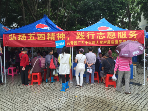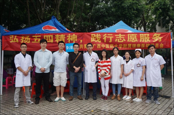 为纪念五四运动97周年和共青团建团94周年,2016年5月1日上午8点,我院团委联合医疗服务部在兴宁区法制广场参加兴宁区朝阳街道党工委、共青团南宁市兴宁区委主办的“青春舞动,互联网+”兴宁区纪念五四运动97周年暨青年电商创业文化活动。我院主要开展义诊、健康咨询、疾病预防知识手册发放等免费医疗服务。