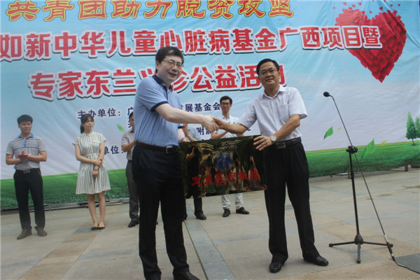 在启动仪式上,广西青少年发展基金会向我院颁发2016年“如新中华儿童心脏病基金”公益项目合作医院牌匾,我院与东兰县新农合管理中心签署“农村两病儿童”定点医疗合作协议。今后,东兰乃至整个河池地区的孩子们,在先心病救治上,将享受极大优惠。