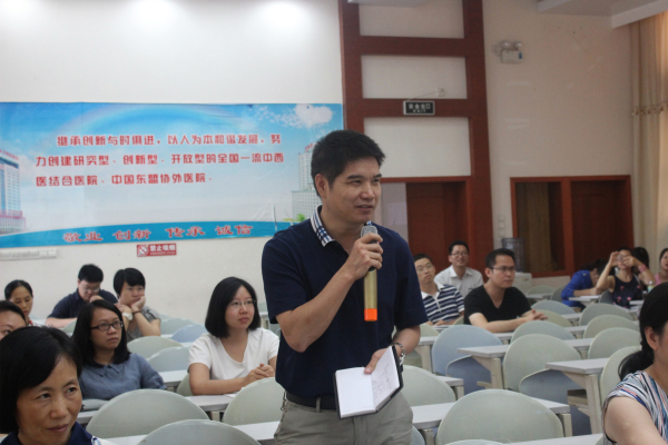 6月29日下午,为进一步规范PBL教学活动,我院邀请广西医科大学第一附属医院教学部赖铭裕教授、儿科梁秀安教授到我院进行PBL教学专题讲座及示范指导。培训会在医院B座10楼教室进行,我院党委副书记、纪委书记陈日兰出席并主持培训会,各教研室主任、教研室秘书,临床医技科室教学秘书,课程负责人,课程整合研究团队成员,临床医学专业任课教师,认证办全体成员参加培训会。