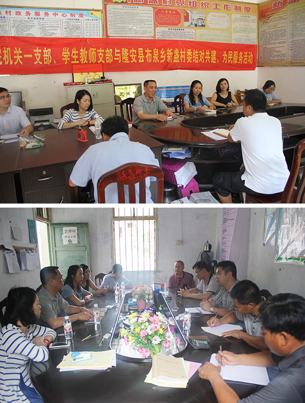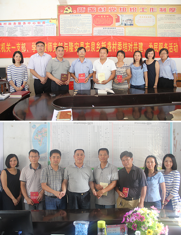 为推进我院“两学一做”学习教育,落实医院党委“五个一”活动要求,加强与基层党组织联系,提升新时期党建工作水平,7月19日,我院党委书记唐友明,党委副书记、纪委书记陈日兰带领机关一支部、学生教师支部党员代表来到隆安县布泉乡新盏村和都结乡念潭村,与当地村委开展“两学一做”结对共建、为民服务活动,并亲切看望我院派驻当地的第一书记粟俊、范小明同志,听取第一书记的工作汇报。