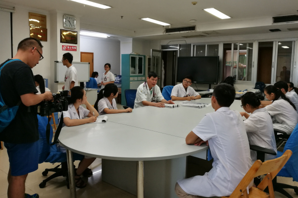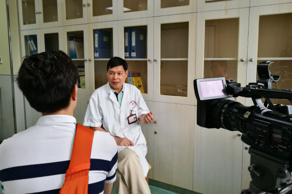 广西电视台一行先后深入消化内科门诊、病房,瑞康临床医学院内科学教研室,图书馆等地进行采访摄制。瑞康临床医学院内科学教研室主任、消化内科副主任林寿宁教授,呼吸内科冯原医师及林教授的3位研究生接受了记者的采访。