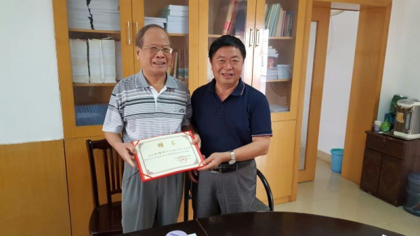 驻会常务副会长、广西社科院李锋院长为胡锡琮教授(左)颁发聘书