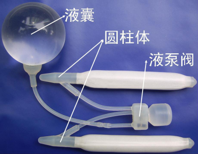 假体又称阴茎支撑体,由液囊、液泵阀和圆柱体三部分组成故名三件套(如下图),是一个硅胶制成的液体循环系统,通过充水增压来支撑阴茎勃起增粗变硬。