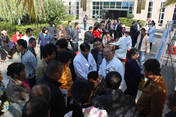 我院肿瘤科一区练祖平主任在新闻发布会上与梧州市卫生计生委、中国人保财险梧州分公司一起对异地“一站式”即时结报政策进行解读。约有50名藤县卫生系统医务人员聆听了我院专家讲座,约100名藤县群众得到了我院专家的细心诊疗。