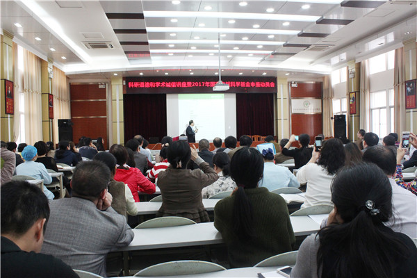 为进一步做好我院2017年度国家自然科学基金项目的申报工作,帮助医院科研人员树立良好的科学素养、培育自主创新的科学道德,进一步提高项目申报质量,2016年12月12日下午,科研道德和学术诚信讲座暨2017年度国家自然科学基金项目申报动员会在我院B楼十楼会议室举行。广西中医药大学财务处副处长韩若彬、科技处副处长王孝勋、我院党委副书记、纪委书记陈日兰出席并作讲座。医院全体中层干部、具备2017年国自基金申报资格及具有博士学位或副高级以上职称的近100余人参加会议。会议由陈日兰副书记主持。