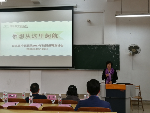 黄国强局长为毕业生详细介绍了田东县医疗卫生事业的发展情况,以及对田东县中医医院的投入情况、对于毕业生的一些优惠政策,希望我院毕业生多多关注田东县中医医院。