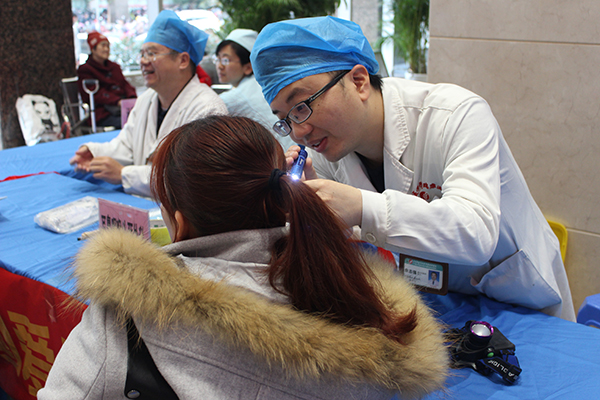 梁阿姨是我院老病友,由于心脏问题她先后在医院做了几次支架手术,她对医院医护人员技术能力和服务水平都非常满意,借着义诊机会,她来咨询一下耳鼻喉科专家自己的耳朵问题。耳鼻咽喉头颈外科彭杰副主任详细询问梁阿姨平时生活用耳情况,并进行细致检查,彭杰副主任建议,梁阿姨平时需要关注听力变化情况,待到科室应用仪器设备得出明确检查结果后,再决定是否使用助听器进行治疗。
