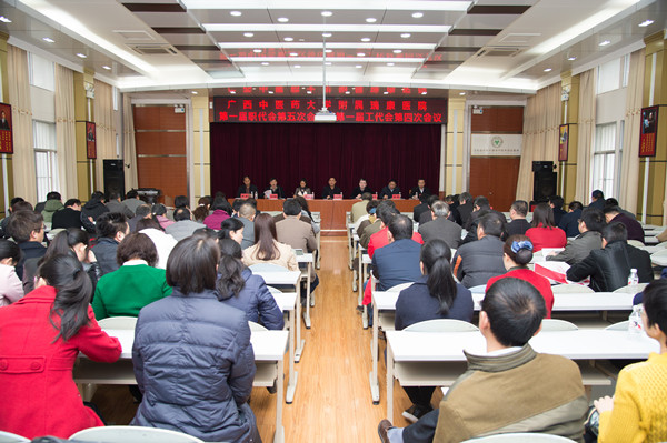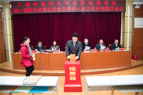 2017年3月18日上午,我院在十楼学术报告厅召开广西中医药大学附属瑞康医院第一届职代会第五次会议暨第一届工代会第四次会议。会议的主要任务是审议在职在编人员养老保险基数申报方案、调整空港院区建设规模等六项提案。包括医院领导班子在内的112名职工代表出席会议,超过应到会代表的三分之二,符合规定人数。医院各科室正职负责人列席会议。