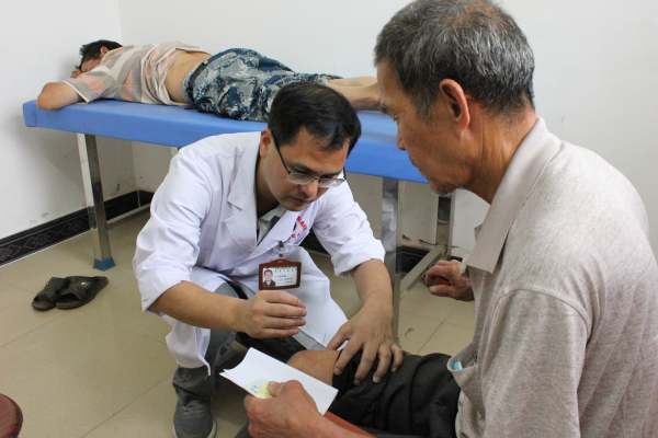 一大清早,我院脾胃病科、妇科、骨四肢科、外科、针灸推拿科等多名专家驱车前往义诊现场。一到目的地,专家们不顾舟车劳顿,一下车便开始义诊。由于那白村卫生室宣传到位,村民特地拿着自己的病历资料早早等候在现场。在针灸推拿科高革新主任的诊台前,排起了队伍等候,高主任一边为病人检查,一边耐心解释,为病人开出治疗处方,现场进行推拿按摩或针灸治疗。一位患有腿痛腿麻的张大爷在他人搀扶下来到高革新主任诊台前,只见高主任为病人检查完后,娴熟地对病人进行了针灸治疗。“见效真快!一下子感觉舒服了好多。”张大爷兴奋地说道。