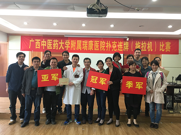 鸣锣开战后,各组选手捉对“厮杀”,选手们密切配合、沉着应战,比牌技、考智慧、赛耐力,有的挠头思考、谋出奇兵,有的故作低调、诱敌深入,有的为谋略“得逞”而开怀大笑,有的因出错牌痛失良机而扼腕叹息,现场欢声笑语不断,气氛非常活跃。经过初赛、复赛、决赛三轮激烈角逐,最终,检验科队力克群雄、全胜夺冠,药学部队、药物研发中心1队获亚军,肿瘤科2区队、关节与运动医学科队、神经外科队获季军。