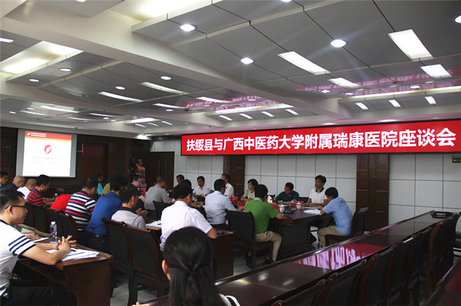 座谈会上,我院院长唐友明首先就空港院区运营情况以及新院区项目建设进展情况进行汇报。自2012年我院整体托管扶绥县中医院并挂牌成立广西中医药大学附属瑞康医院空港院区以来,我院投入了大量资金进行院区环境改造和设备改造,同时相继委派具有高级职称及丰富临床经验的技术人才到空港院区工作,切实有效地提高了医院整体技术力量,实现了扶绥人民在家门口就能享受到省级专家的诊疗服务。但现阶段医院也面临着基础设施老旧、结构不合理、没有进一步改造和利用的空间以及财政扶持力度欠缺等实际困难。空港院区新门诊住院医技综合大楼项目自2015年11月开工建设以来,目前一期工程主体已经封顶,内部装修工作预计在今年10月底完成,二期工程也已着手招标工作,但项目也面临土地预审及缺乏相关政策支持等困难。希望县委县政府持续创优环境、提供便利,和瑞康医院共同推进新院区项目建设工作,确保新院区项目早日建成、早日让百姓受益。