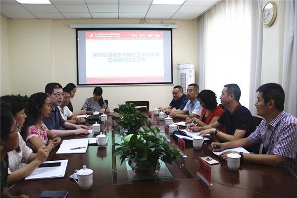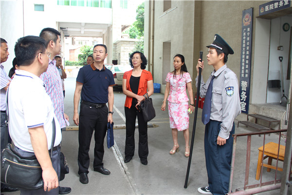 7月10日上午,南宁市反恐支队副调研员宁卫祥一行6人莅临我院,督导检查我院反恐工作开展情况。医院党委书记高宏君,党委副书记、副院长陈日兰及党办、医务部、后勤科等相关职能部门负责人热情接待并陪同检查。