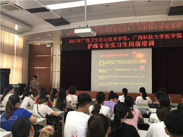 为帮助实习生尽早融入临床,了解和掌握实习期间各项规章制度以及各种常见问题的处理方法,保证临床教学质量及医疗护理工作的顺利开展。 3月6日至7月11日,我院护理部对来自广西中医药大学、广西医科大学、右江民族医学院、桂林医学院等8所院校,包括本科生、大专生共计326名护理实习生进行了分批次的岗前培训。