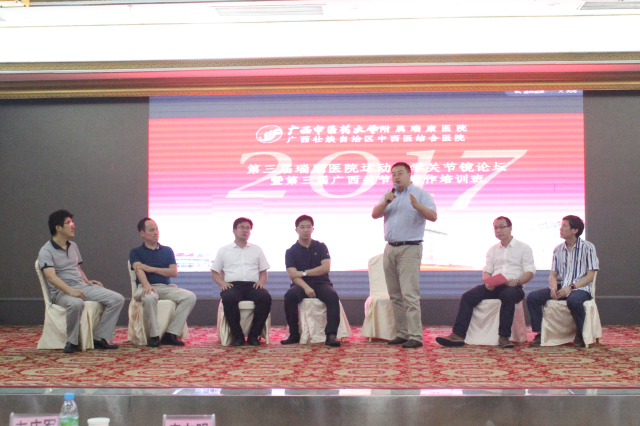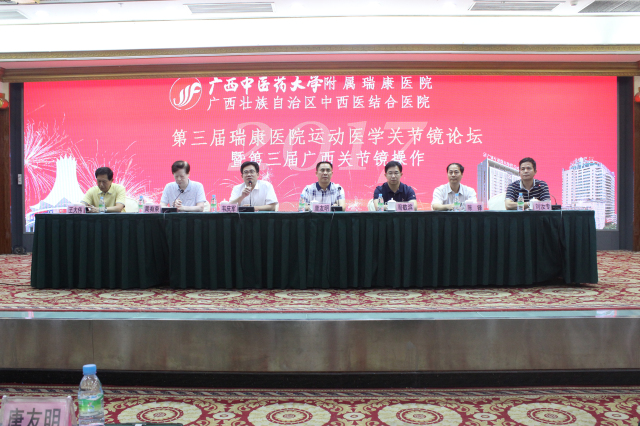 2017年7月15-16日,由广西中医药大学附属瑞康医院主办的第三届运动医学关节镜论坛暨第三届广西关节镜操作培训班在南宁顺利召开。我院院长唐友明出席论坛开幕式并致辞。香港中文大学医学院骨科教授及威尔斯亲王医院运动创伤科主任容树恒教授,国家体育总局运动医学研究所体育医院运动创伤科主任周敬滨教授,广西医科大学第一附属医院韦庆军教授,河北医科大学第三医院关节科董江涛教授,我院副院长、中医骨伤科学科带头人陈锋教授,广西中医骨伤分会名誉主任委员、第五批全国名老中医黄有荣教授,我院大骨科荣誉主任王大伟教授,大骨科主任、脊柱外科2区主任刘汝专教授列席。全区各医院200余名骨科医生参加论坛。大骨科主任、脊柱外科2区主任刘汝专教授主持大会开幕式。