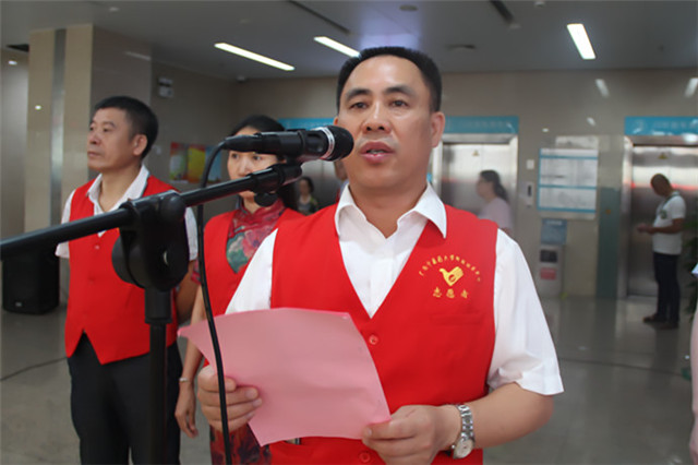 医院党委书记高宏君为志愿者服务队授旗。志愿者代表、我院关节与运动医学科护士、南宁市造血干细胞第100例捐献成功者蓝芸作为志愿者代表作了表态发言。志愿者们在启动仪式上进行了集体宣誓。