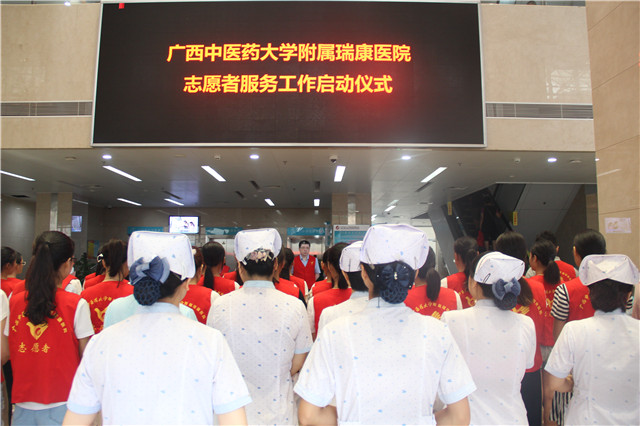 8月4日上午,我院志愿者服务工作启动仪式在医院门诊住院综合楼A座大厅举行,医院院长唐友明,党委书记高宏君,党委副书记、副院长陈日兰,副院长庞刚,副院长韦思尊,党委副书记、纪委书记黄建民以及各职能科室主任、护士长和志愿者代表参加启动仪式。