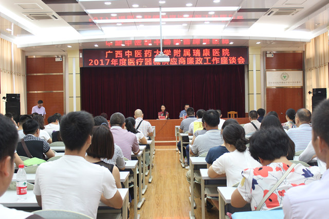 8月4日下午,我院在B座十楼召开了2017年度医疗器械供应商廉政工作座谈会,我院党委副书记、副院长陈日兰,党委副书记、纪委书记黄建民出席,纪检监察室主任覃洁梅、副主任吕艳,医疗装备科科长崖崭崭、副科长袁春华,以及其他相关负责人及医疗器械供应商代表参加座谈会。