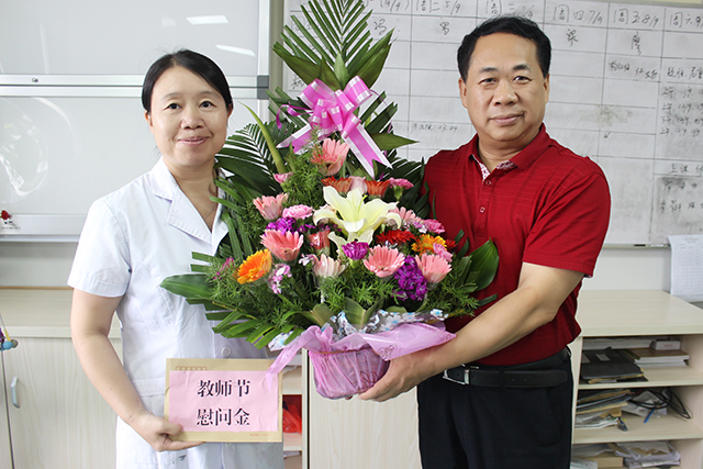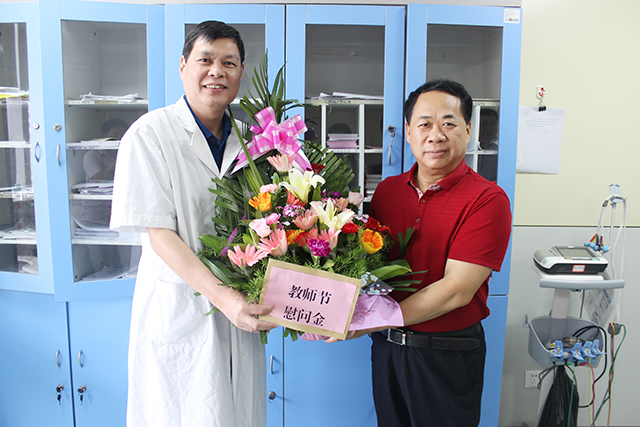 “林教授辛苦了,祝贺你荣获‘中国好医生’称号!”罗副校长一行首先来到消化内科看望慰问内科教研室主任林寿宁教授。先后荣获2017年8月“中国好医生”月度人物、入围20名寻找“莫振高式八桂好老师”人选的林寿宁教授是我院优秀教师的典型代表,他躬身传道,德育杏林,身体力行30余载,教授学生万余人,先进事迹享誉区内外。罗伟生副校长向林教授送上鲜花和慰问金,对林教授诲人不倦、为人师表的崇高师德表示敬意。