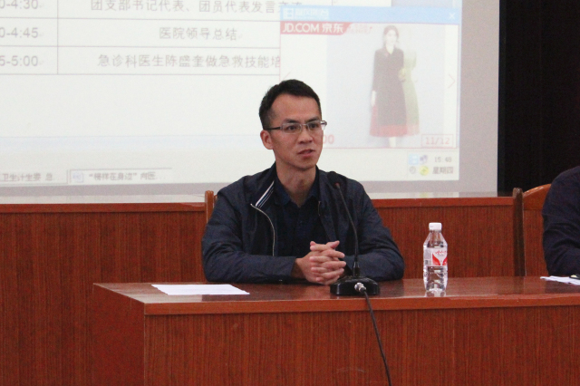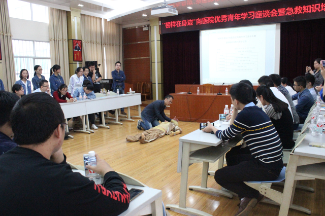 10月19日下午,我院团委、社工部组织开展“榜样在身边”向医院优秀青年学习座谈会暨急救知识培训活动,医院党委副书记、纪委书记黄建民参加并作讲话,团委、医疗服务部、教职工各团支部书记及团员代表、学生各团支部书记及团员代表共40名参加。