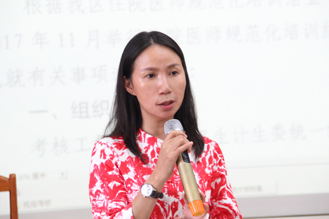 培训会上,陈日兰副书记向同学们介绍了当前面临的考核政策与形式,指出本次考核工作由自治区卫生计生委统一组织,由各相关住院医师规范化培训基地负责具体考务工作,并同学们介绍了本次考试各项工作的负责老师,以及考试时间、内容、形式等具体细节。同时她强调,规培学员一定要承担起教学任务,鼓励大家在规培过程中与带教学生一起刻苦钻研,勤于练习。她详细地解释了考核站点的内容以及注意事项,例如建立临床思维,注意人文关怀、爱伤观念,牢记无菌观念等。