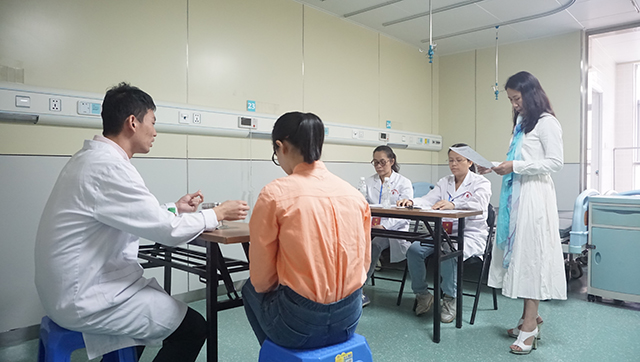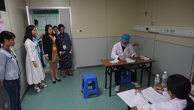 根据《自治区卫生计生委关于做好2017年广西住院医师规范化培训结业考核考务工作的通知》的要求,11月5日,我院分别在B座10楼会议室和A座9楼教室顺利进行2017年中医住院医师规范化培训结业考核技能考试的临床技能笔答和临床技能操作两个部分的考试。院长唐友明,党委副书记、副院长陈日兰,党委副书记、纪委书记黄建民等院领导莅临现场指导考核工作,院内规培人员及2014级研究生规培人员90人参加考试。