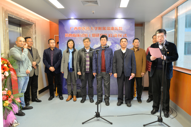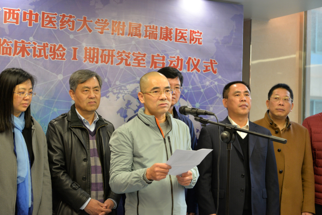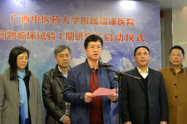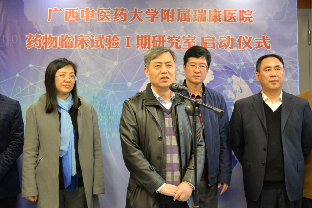 自治区食品药品监督管理局注册处黄祥远处长在讲话中指出,药品关系人身健康和生命安全,药品安全责任重于泰山。新药的研究开发关键环节就是药物临床试验,而I期药物临床试验是新药研究的非常重要的环节。药物临床试验肩负着药品有效性与安全性的重任。目前我国已批准1.5万个药品品种,16.8万个批准文号,主要以仿制药为主。为提高仿制药质量标准,我国目前对已上市仿制药分批开展一致性评价,逐步解决已上市药品的质量问题。明确289个口服基药品种必须在2018年底前完成一致性评价。单靠现有的数十家I期临床试验机构开展BE试验,一致性评价将无法按期完成,BE试验机构与BE的供需矛盾短期内仍十分突出。广西中医药大学附属瑞康医院积极响应国家层面的需求,以仿制药一致性评价、生物等效性研究为抓手,建设I期临床试验研究室,将有助于缓解广西及全国一致性评价的压力,有利于降低医药总费开支,提高国产仿制药竞争力。同时借助临床药物试验平台争取有朝一日发展成为新医疗技术、新药品、新医疗器械的转化中心。希望瑞康医院在临床试验过程中严格执行GCP有关要求,以实际行动落实“四个最严”的标准,通过在试验管理、规范性等方面全面加强能力建设,保护受试者的权益、严控试验风险,严抓项目质量、不断学习提升水平,创建GCP品牌。