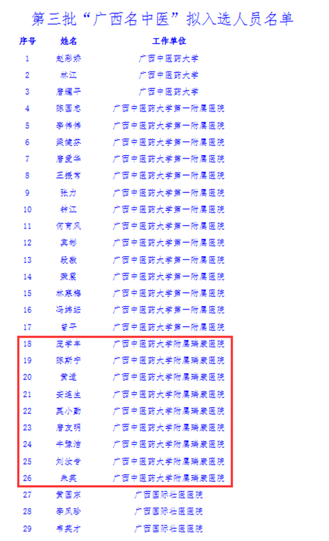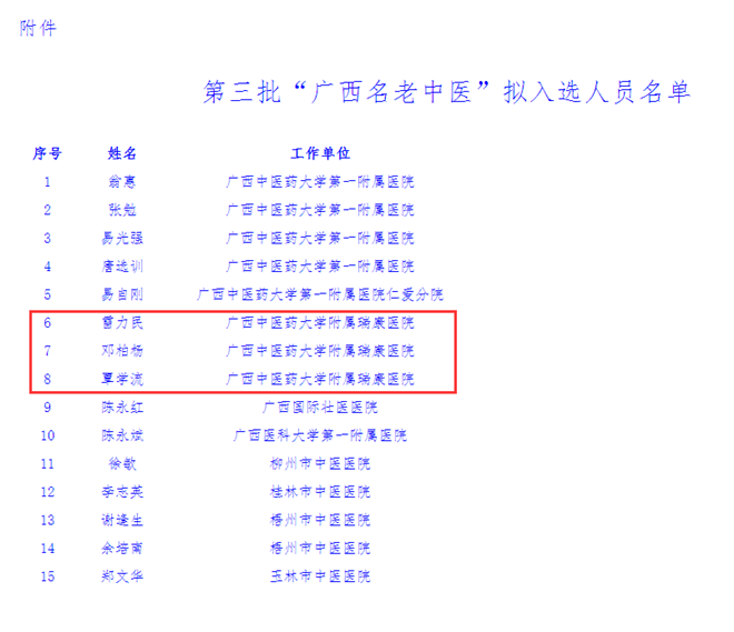 近日,第三批“广西名老中医、广西名中医”拟入选人员名单公示,广西最终拟评选出15位教授为第三批“广西名老中医”,45位教授为第三批“广西名中医”。其中我院有3名教授通过广西名老中医、9名教授通过广西名中医的评审。