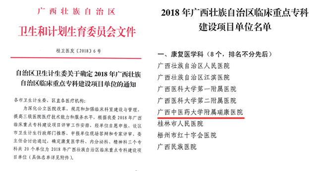我院康复医学科经过自愿申报、部门推荐、现场答辩、专家评审和卫计委主任会讨论等环节,获评为2018年广西壮族自治区临床重点专科建设项目单位,为广西中医系统唯一单位。