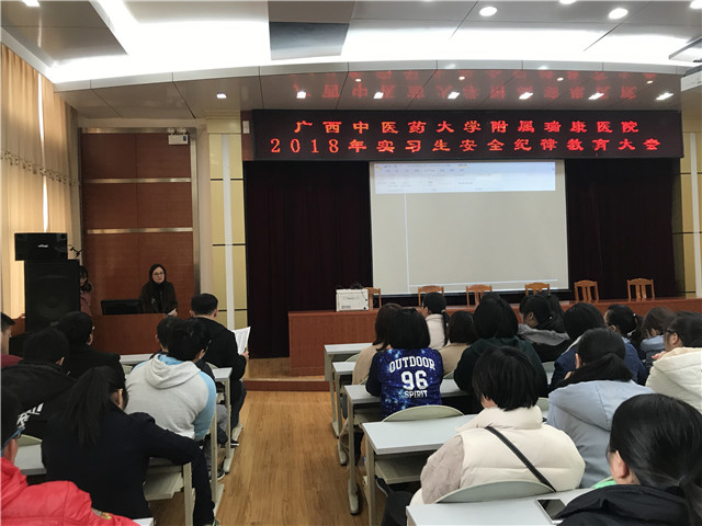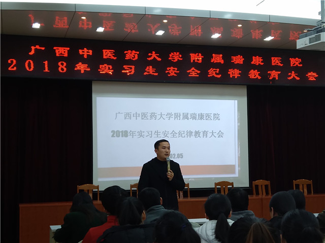 为了加强实习生纪律教育,确保实习生培养质量。2018年2月5日下午我院教务科在B座10楼教室召开瑞康临床医学院2018年实习生安全纪律教育大会。教务科科长汪国翔,教务科负责实习生管理的谢思蓉老师及韦晓晗老师出席会议。我院2018届374名实习生分两批参加会议。