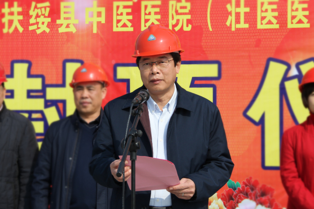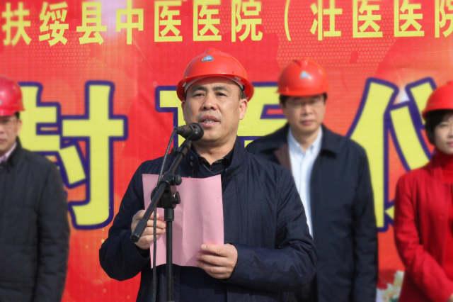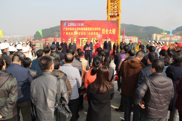 院长唐友明首先对莅临封顶仪式、共同见证空港院区发展历史时刻的领导和来宾表示热烈欢迎,对一直关心和帮助空港院区建设项目的领导和长期以来一直奋斗在工地一线的施工方、监理方以及全体工友们表示最衷心的感谢。唐院长介绍,2012年,我院积极响应党和国家的号召,受扶绥县委县政府的委托,全面托管扶绥县中医医院成立空港院区。接管后医院不断加大人才、资金及设备的投入,在全体职工的共同努力下,通过五年多的经营和管理,医疗技术和服务水平得到扶绥县人民的广泛认可,获得了良好的社会效益,基本实现了大病不出县的目标,人民群众看病就医获得感显著增强。经过努力,2017年空港院区项目被列入“国家中医药传承创新项目”和“广西‘十三五’期间医疗卫生计生领域建设项目”储备库,为空港院区项目的建设注入了强劲动力。门诊住院医技综合大楼封顶以后,医院将加快落实内部装修,完善医疗设备的配备,按照国家“三甲”医院的标准进行建设,争取在今年年底投入使用,为自治区成立60周年献礼,医院将秉承“衷中参西,厚德精医”的院训,坚持中西医结合的办院方向,把西医做精做强,中医做特做优,全面传承和发展壮瑶医药,将空港院区打造成为中西医结合区域诊疗中心,为扶绥县的经济发展和人民群众的健康做出更多更大的贡献,为实施“健康广西”战略作出新的贡献。