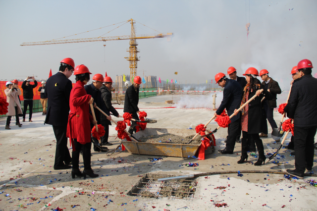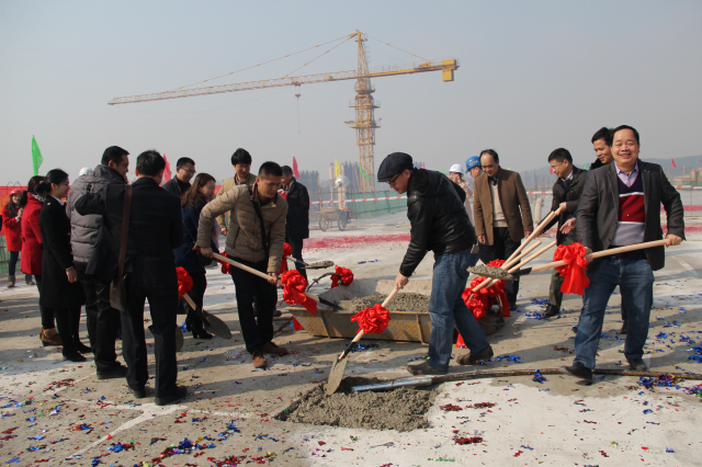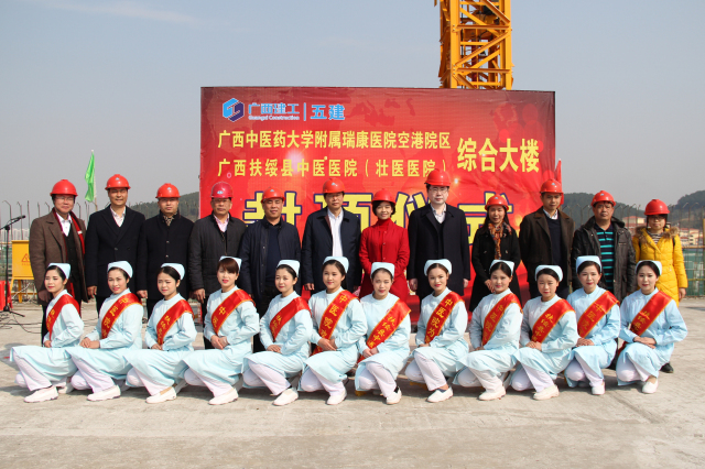 经过2年多的建设,我院空港院区(扶绥县中医医院)门诊住院医技综合大楼按质按量完成了建设目标,主体结构顺利封顶。2月8日上午10:18,封顶仪式在项目建设工地召开。广西中医药大学副校长吴琪俊,扶绥县委常委、宣传部部长、副县长陈英,扶绥县卫计局副局长卢辉球,扶绥县消防大队参谋长郭俊,扶绥县人民防空办公室主任黄清武,空港管委会招商部部长陆华、副部长吴艳萍,扶绥县住建局副局长黄树新,我院院长唐友明,党委书记高宏君,党委副书记、副院长陈日兰,副院长庞刚,党委副书记、纪委书记黄建民,副院长陈锋,空港院区执行院长梁春才,医院中层干部代表出席仪式,共同见证了这历史性的时刻。封顶仪式由党委书记高宏君主持。