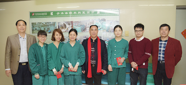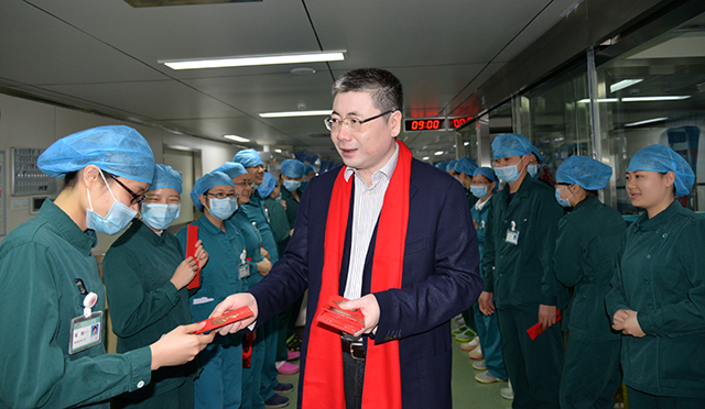 戊戌狗年除夕夜和大年初一,医院院长唐友明,党委书记高宏君,副院长韦思尊,党委副书记、纪委书记黄建民,副院长陈锋来到医院慰问春节期间坚守一线的医务人员、后勤值班人员及住院病人,送上真情祝福,向他们致以节日的祝贺和亲切的慰问。