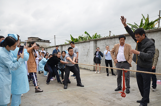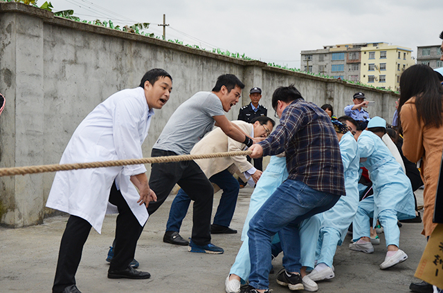 在比赛现场,由田阳院区各科室组成的8个参赛队按照抽签排序进行拔河比赛。赛场上,参赛选手们个个精神抖擞、激情满怀,双手攥紧粗绳,身子后仰,脚弯成弓步,使出全身力气,两队选手你来我往,场面十分激烈。赛场下啦啦队的呐喊声、欢呼声、喝彩声彼此起伏,不绝于耳。