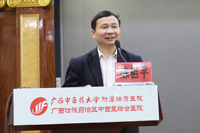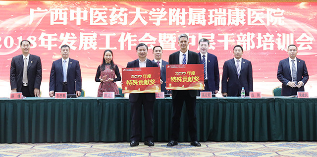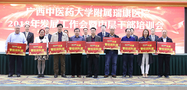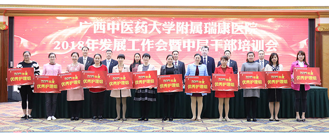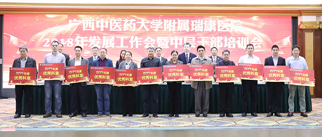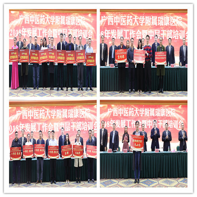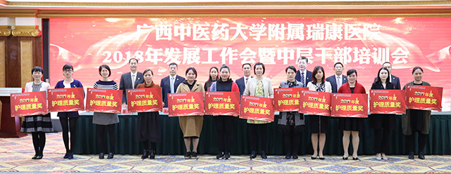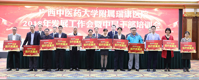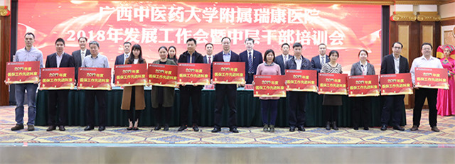 唐友明院长在会上围绕“重质量 强特色 树品牌奋力谱写瑞康医院发展新篇章”作报告,唐院长在报告中用凝练的语言,高度概括了2017年医院的成绩:新增国医大师1人,新增第六批名老中医经验传承指导老师3名,第四批全国优才1名,广西名老中医3名、广西名中医9名;新增李桂文全国名老中医工作室;组建医院“重大项目办公室”;成立中西医结合医学转化中心;成功引进上海交大李荣秀教授高层次科研团队;荣获广西医疗服务百姓口碑榜的“综合实力奖”“医德医风奖”“公益先锋奖”三大奖项;荣获“中国红十字基金会2017年度彩票公益金项目儿童大病救助工作优秀单位”称号;荣获国家“2017年优质服务示范社区卫生服务中心”称号;荣获“广西卫生应急技能竞赛”区直单位比赛团体及个人第一名;创新医联体建设,帮扶基层学科人才建设,医共体建设初具规模;国医大师韦贵康教授、全国名老中医林寿宁教授荣获“中国好医生”月度人物称号等等。他从14个方面翔实地介绍医院上一年度的工作成效:一是业务实现新增长;二是医疗质量明显提高;三是护理工作取得新成效;四是学科设置进一步优化;五是中医特色建设取得新进步;六是多措并举适应医改新形势;七是实施改善医疗服务行动计划初显成效;八是教学工作迈上新台阶;九是科研工作呈现新气象;十是艾滋病防治研究工作取得新进展;十一是人才及干部队伍建设不断加强;十二是全心全意为职工谋福祉,职工收入明显增长;十三是宣传工作和文化建设成绩突出;十四是党的建设进一步加强。