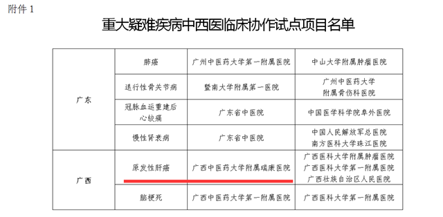 据了解,为提高医疗机构健康服务能力和综合医疗救治水平,更好的维护人民群众健康权益,国家中医药管理局联合国家卫生计生委、中央军委后勤保障部卫生局于2015年底启动了重大疑难疾病中西医临床协作试点申报工作,以提高重大疑难疾病临床疗效为目的,中西医双方通过整合资源、优势互补、协同攻关,探索中西医结合防治疾病的新思路、新方法和新模式。经各单位联合申报、各省(区、市)初审推荐、形式审查、专家评审等程序,确定58个项目为重大疑难疾病中西医临床协作试点项目,我院被确定为原发性肝癌病种牵头单位,将联合广西医科大学附属肿瘤医院等单位就原发性肝癌开展中西医结合联合攻关。