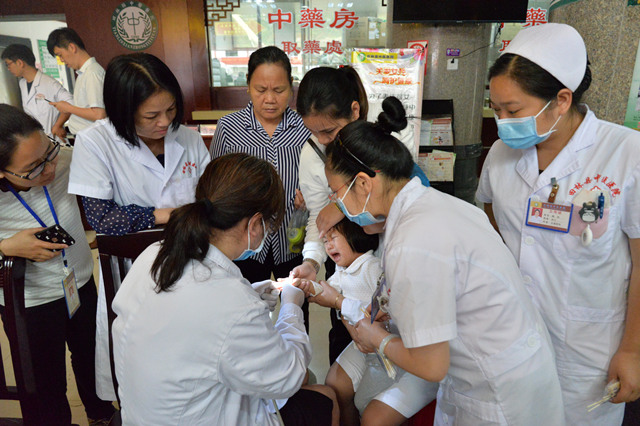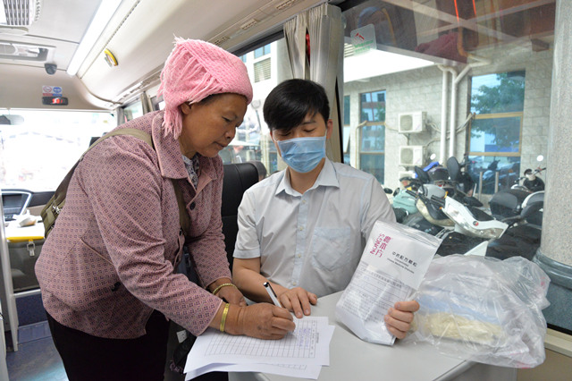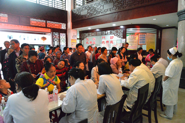 25日早上九点大型义诊活动正式开始,我院农本方中药颗粒医用车也在现场为儿童及55岁以上病友免费提供三天用量的用药。由于经济、路程等原因,许多当地群众难有机会走进大医院获得资深专家的看诊,于是义诊开始前,便有数十名群众早早地在医院大堂等待专家到来,对此次义诊十分期待。我院专家到位后立刻投入义诊中,一边为病友们看诊查体、诊疗开药,一边与田阳县中医医院的医护人员交流心得经验、进行技术指导。