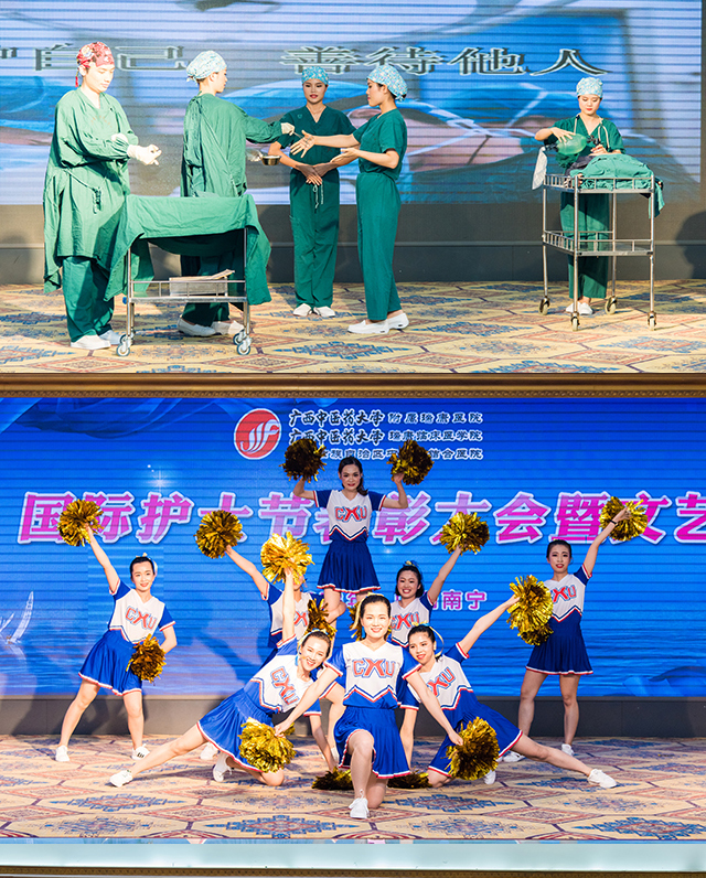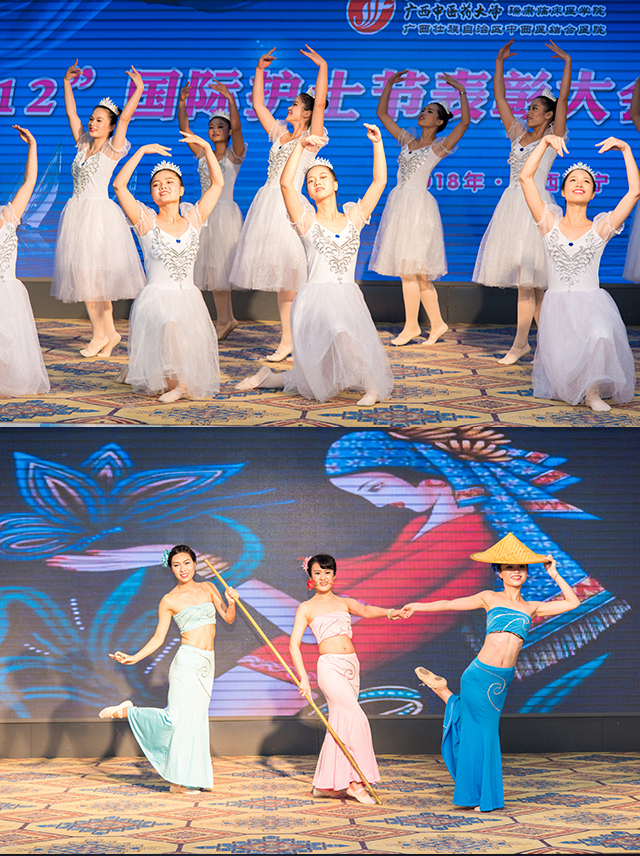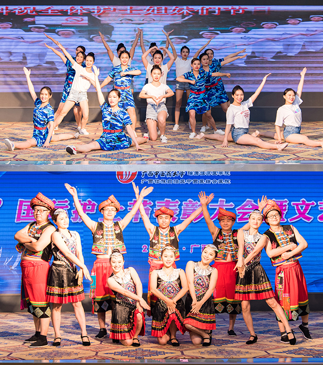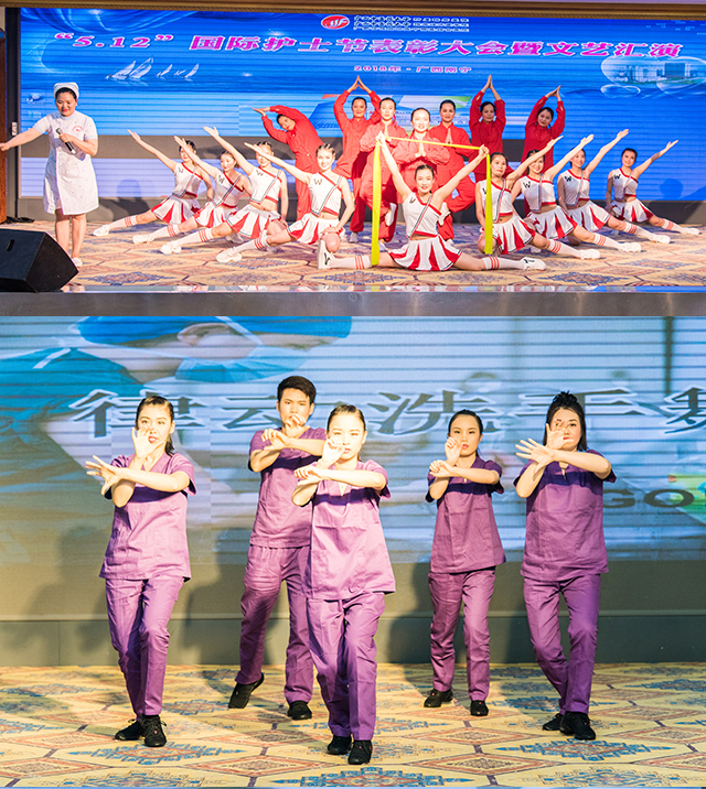 在观看了宣传部制作的护士节微电影《30年不忘初心 不负韶华》后,文艺汇演在右江医学院实习护生的芭蕾舞《云中漫步》中拉开帷幕,门急诊联队为大家表演了俏皮又婀娜多姿的傣族舞《绍多丽》,大骨科的《天使展翅》、重症医学科的《医路芳华 守护有我》、心脏康复中心联合心内一区的养生保健操《向健康看齐》及手术室的《时尚无影手》展现了广大护理工作者们在工作中专业的形象及走中西医结合发展道路的决心,整形美容中心的《赶圩归来阿哩哩》、大外科联队的《play with fire》、神经内科、呼吸内科、肾内科联队的《时装秀》的青春活力引发了全场的欢呼,心血管内科、消化内科、肝病内科联队的礼仪展示及舞蹈节目《快乐的天使》展现了我院护士与护二代积极向上的精神风貌,妇产科、五官科联队的舞蹈《相思垢》、护理部及内科护士长联队的诗歌朗诵及伴舞《诗意中国》展现了我院护理工作者对民族传统文化的自信和自觉担当,“在一起穿过了风和雨,在一起走来了新天地……”瑞康男神唐友明院长为大家带来了深情又动人的演唱《爱在天地间》,晚会在王玉洁的《阳光路上》的歌声中圆满结束。
