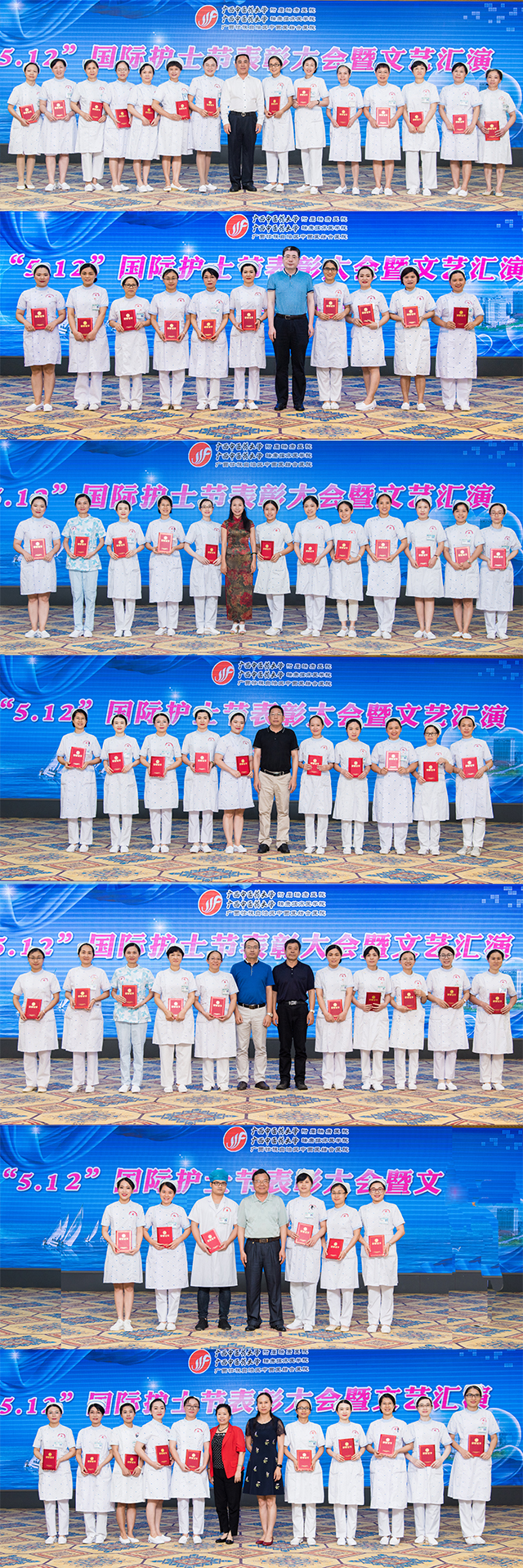 5月11日晚,我院在凤凰宾馆多功能厅举办“5.12”国际护士节表彰大会暨文艺汇演活动,白衣天使们用悠扬的歌声和优美的舞蹈庆祝自己的节日。医院院长唐友明,党委书记高宏君,党委副书记、副院长陈日兰,副院长庞刚、韦思尊,党委副书记、纪委书记黄建民,副院长陈锋,广西中西医结合研究所所长龙学明,广西中医药大学护理学院副院长胡艳宁、党委副书记韩叶芬出席并与各临床及行政科室主任、700多名护士共同观看了文艺演出。 表彰大会由陈日兰副书记主持。