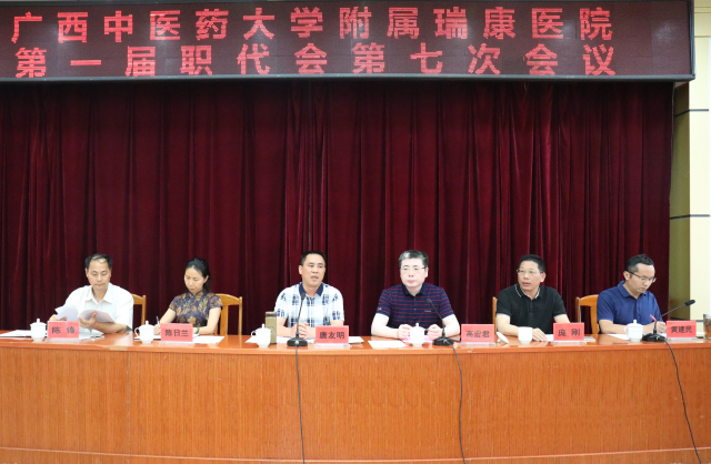 5月23日下午,我院在B座10楼会议室召开了广西中医药大学附属瑞康医院第一届职代会第七次会议。会议的主要任务是审议筹建凤岭南医院提案、更新购置一台医用X线血管造影机(DSA)提案及施行《广西中医药大学附属瑞康医院员工奖惩细则(草案)》提案。此次会议,包括医院院长唐友明,党委书记高宏君,党委副书记、副院长陈日兰,副院长庞刚,党委副书记、纪委书记黄建民,副院长陈锋在内的99名职工代表出席,超过了应到会代表的三分之二,符合规定人数。
