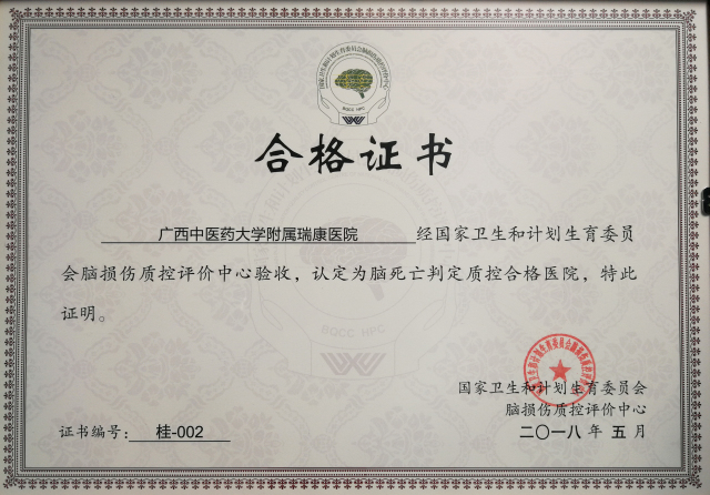 自治区卫计委医政医管处卢德成处长表示,瑞康医院近年来开展脑损伤评价、脑死亡判定的工作取得了不错的成绩,希望广西有更多医院成立脑损伤评价,尤其是脑死亡判定的科室和部门,大力开展业务,创造符合标准与规范要求的条件进行申报,为推进广西的脑损伤评价尤其是脑死亡判定工作作出努力。