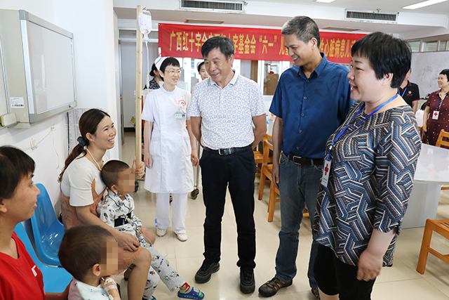 5月31日上午,自治区红十字会副会长潘雪红一行带着节日的礼物以及浓浓的关爱来到我院胸心外科,亲切看望和慰问在我院接受治疗的先天性心脏病患儿。我院副院长韦思尊以及胸心外科医护团队代表陪同慰问。
