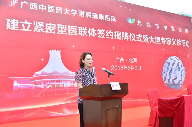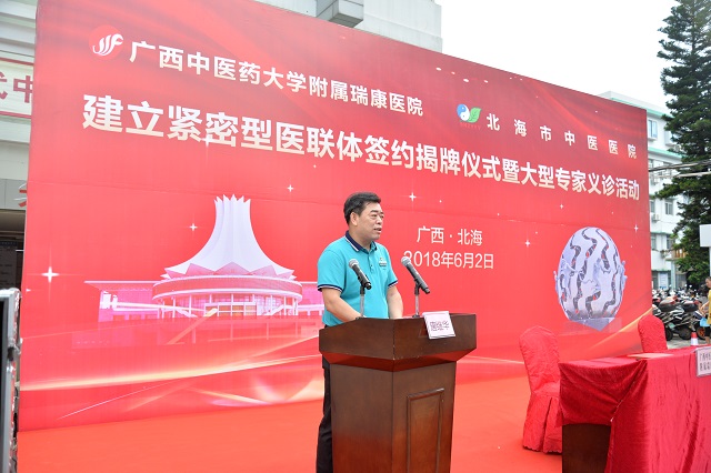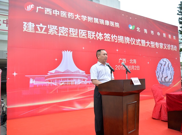 北海市委常委、宣传部部长、副市长黄江在仪式上说,广西中医药大学附属瑞康医院和北海市中医医院“紧密型医疗联合体”的成立,是北海市医疗卫生计生工作走“联大靠强”的道路开展医疗集团工作的具体体现,是北海市医疗战线上的一件大喜事,对深化北海市医疗体制改革,加快北海市医疗卫生事业发展,先进医疗技术、管理理念由上而下沉淀,保障民生医疗服务需求的渴望,都将起到积极的推动作用。