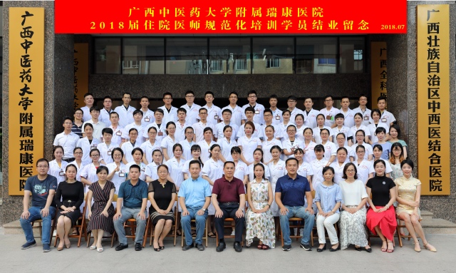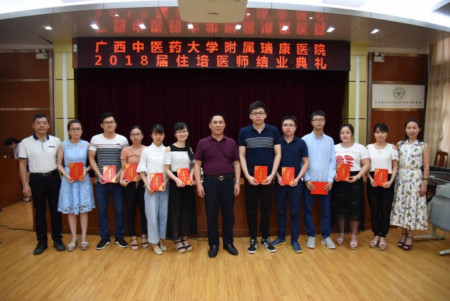韦思尊副院长宣读《关于表彰2018届优秀住培医师的决定》,医院院长唐友明、医院党委副书记、副院长陈日兰,医院副院长韦思尊,为优秀住培医师颁发了荣誉证书并合影留念。